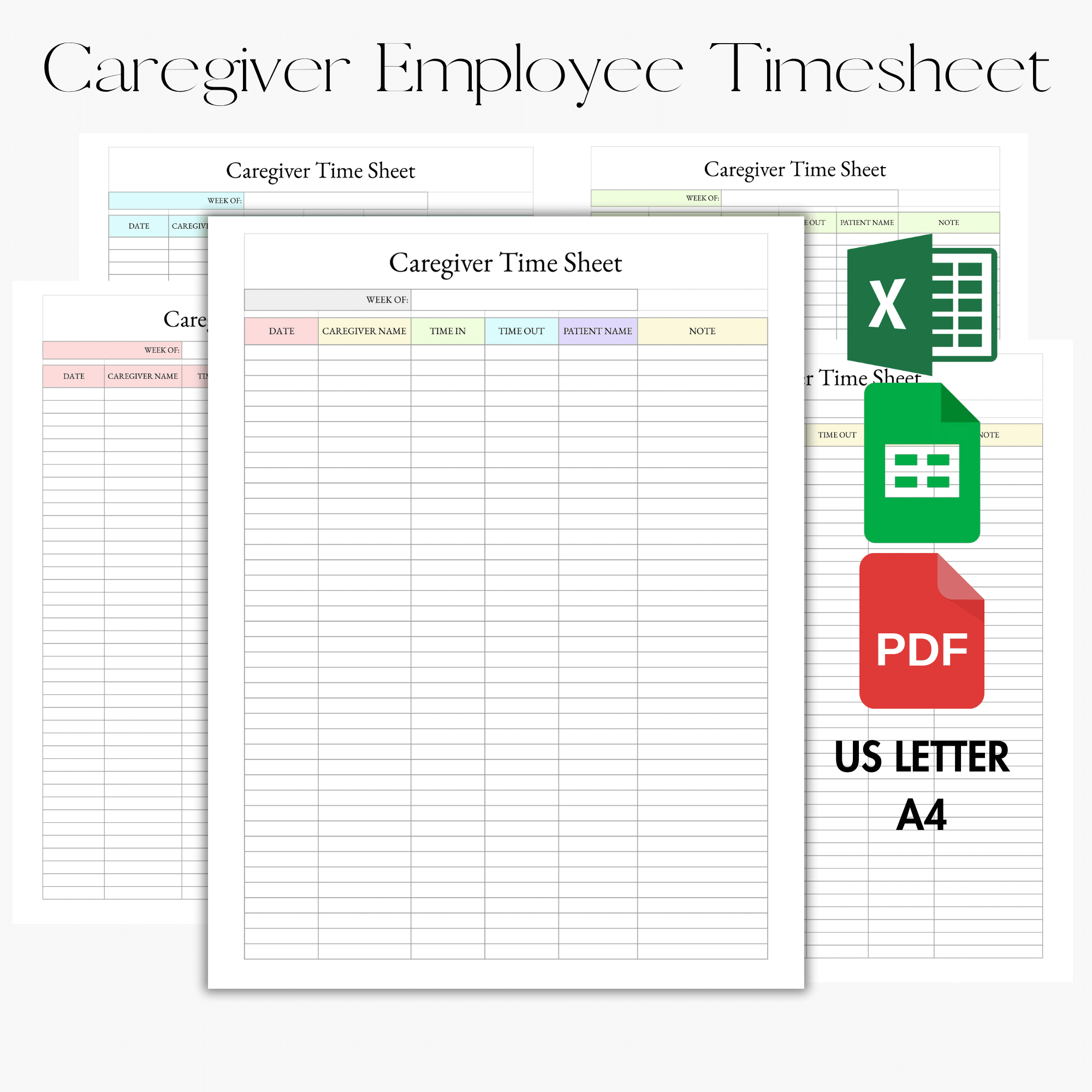 Caregiver Employee Timesheet Google Sheet & Excel PDF Printable| Health Care Hours Worked | Home Health Nurse Schedule | Caregiver Shift Tracker
