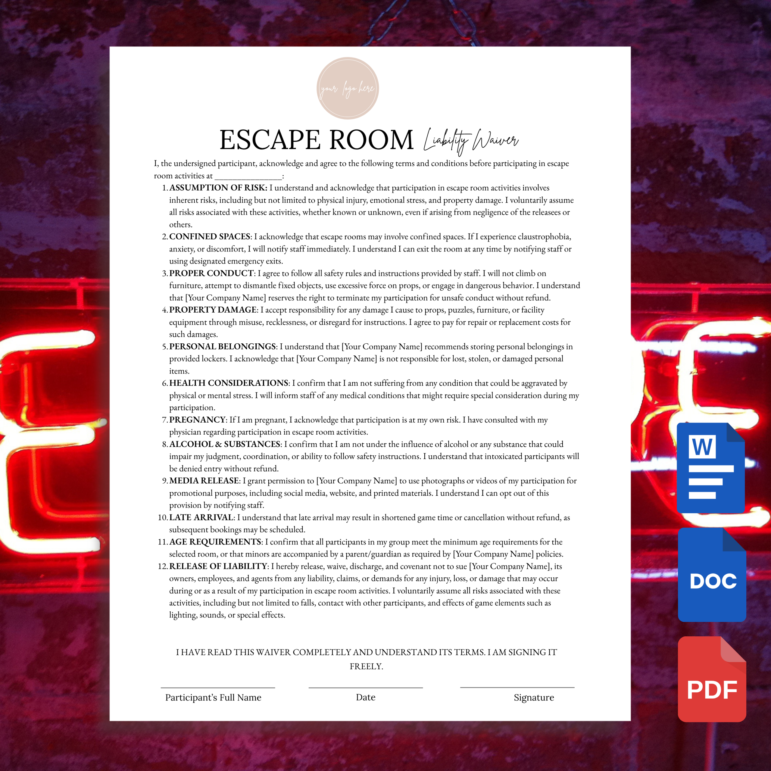 Home Liability Waiver Editable Simple Escape Room Liability Waiver