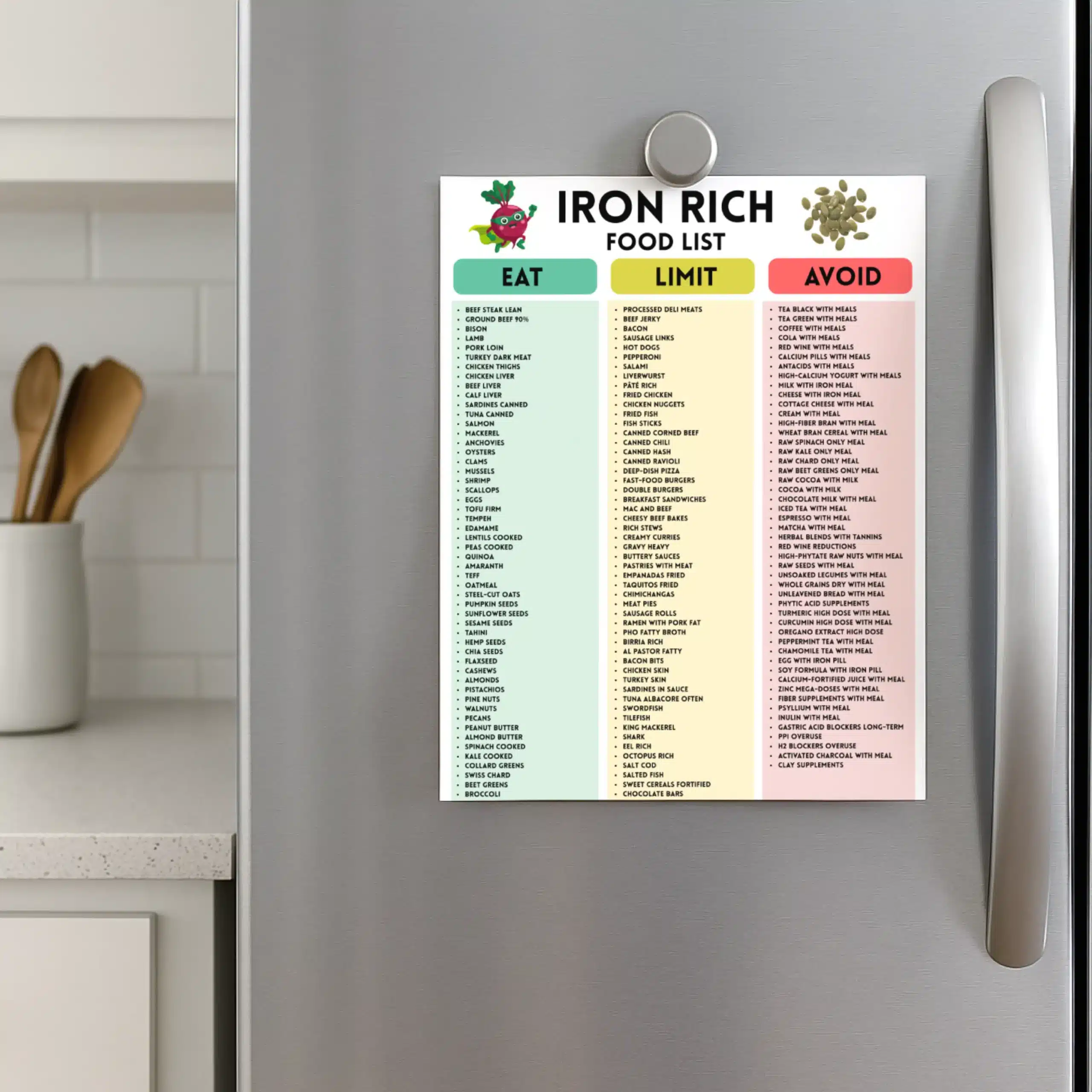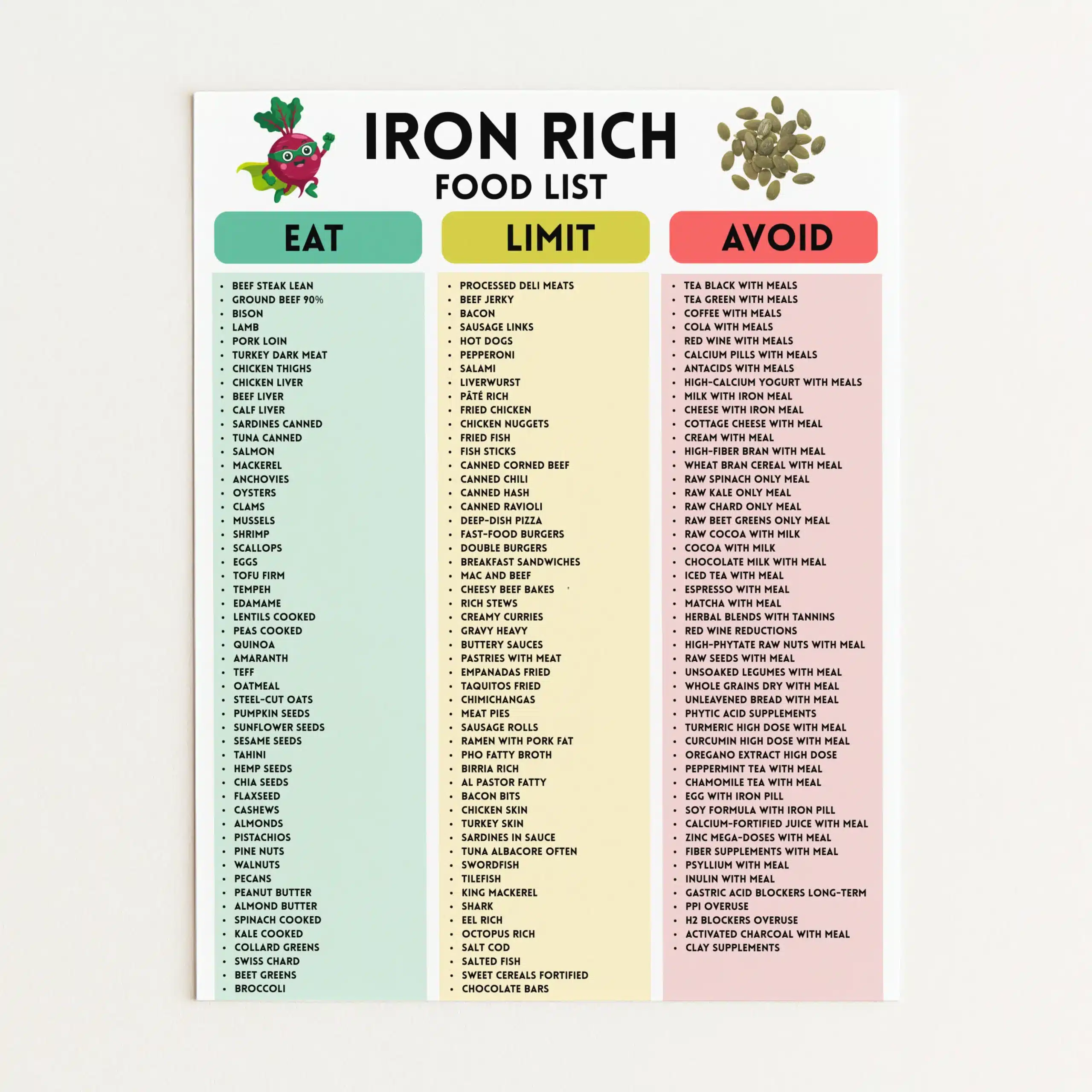 High Iron Foods List Printable, Iron-Rich Chart PDF, Foods High in Iron Chart, Printable High Iron Diet Food List, Iron Sources Food List
