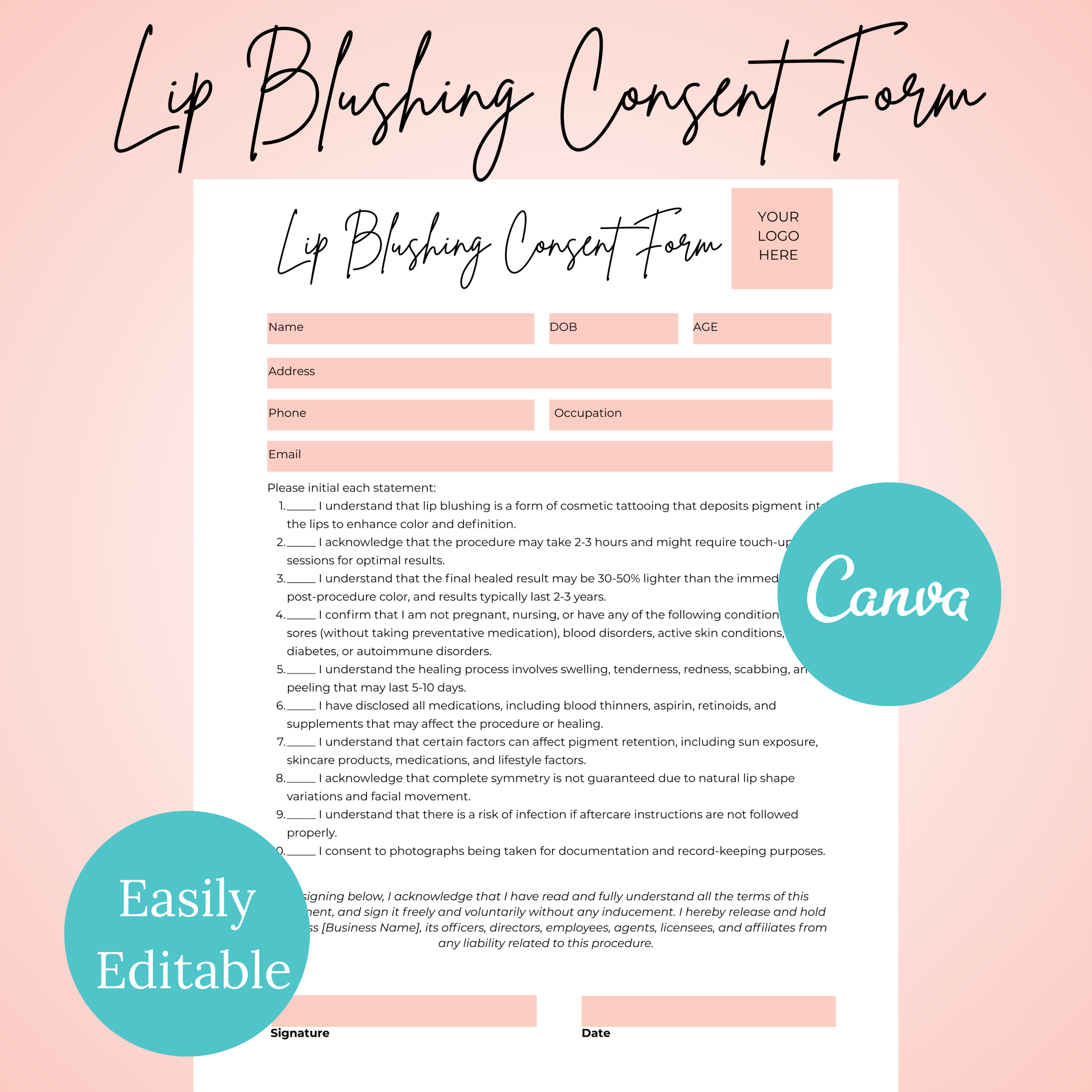 Lip Blushing Consent Form Template, Editable Esthetician Business Form, PMU, Canva Form, Lip Tattoo Form