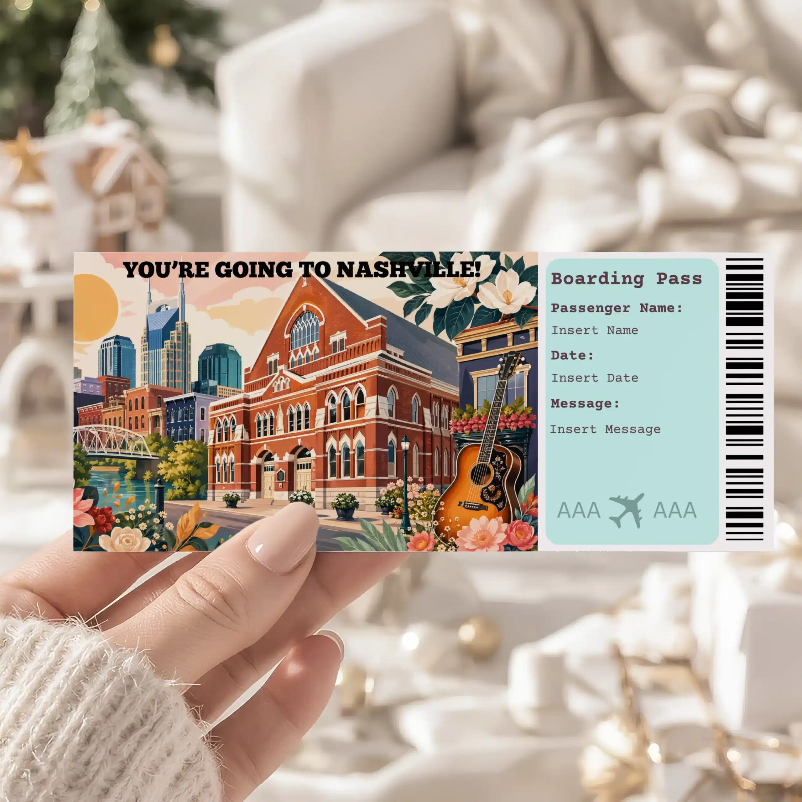 Editable Nashville Boarding Pass Template , Nashville Surprise Gift Ticket, Printable Plane Ticket, Printable getaway voucher, Surprise Travel Reveal, Flight Ticket, Download, Nashville