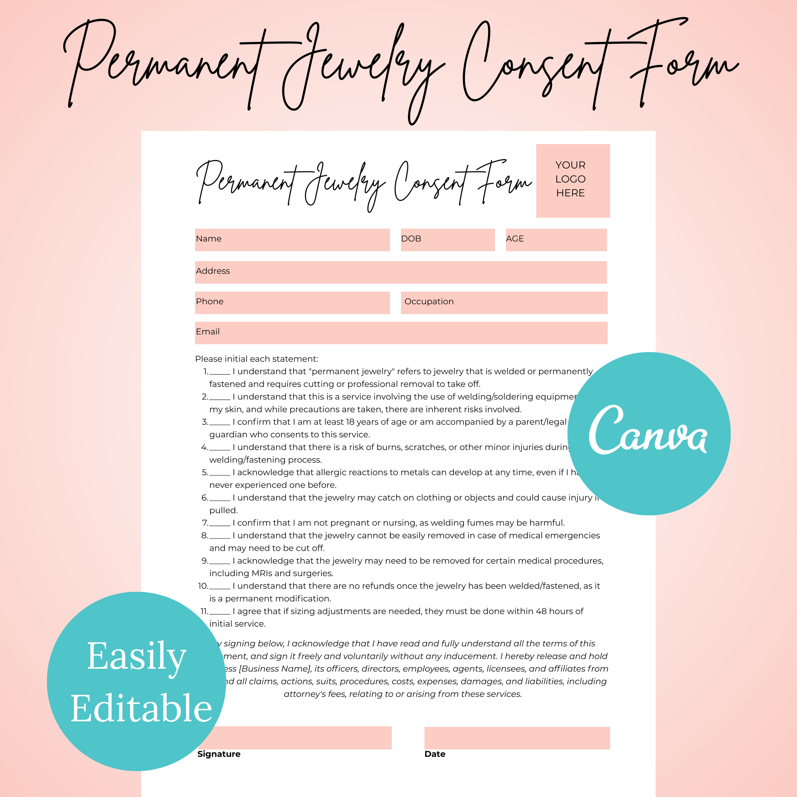Permanent Jewelry Consent Form Template PDF, Editable Consent Form, Permanent Jewelry, Permanent Jewelry Legal Waiver, Digital Download