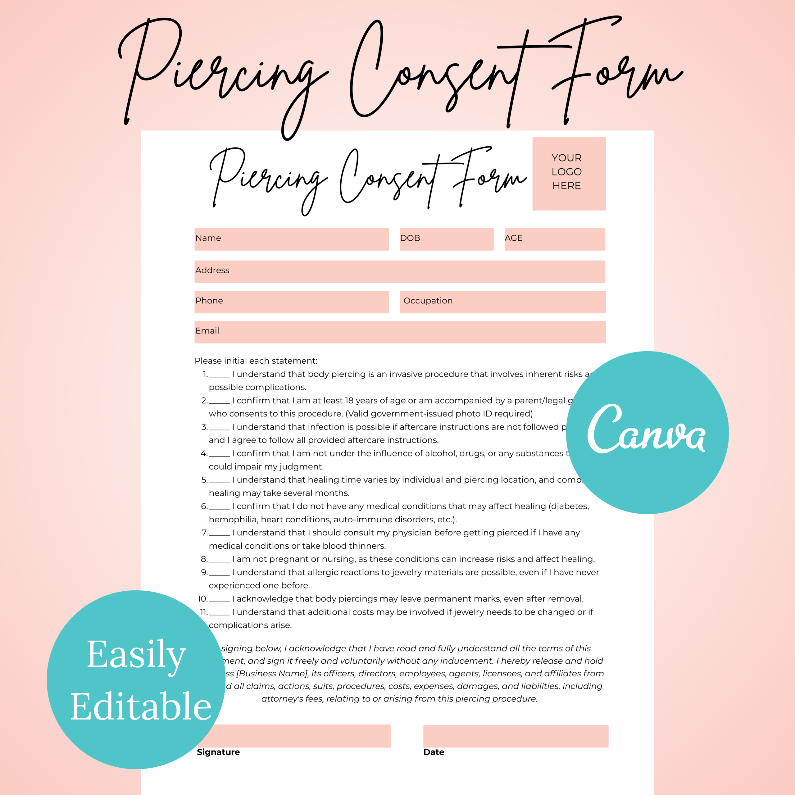 Piercing Client Intake and Consent Form, Ear Piercing Form Template, Body Piercing Client Form, Client Intake Template, Client Consent