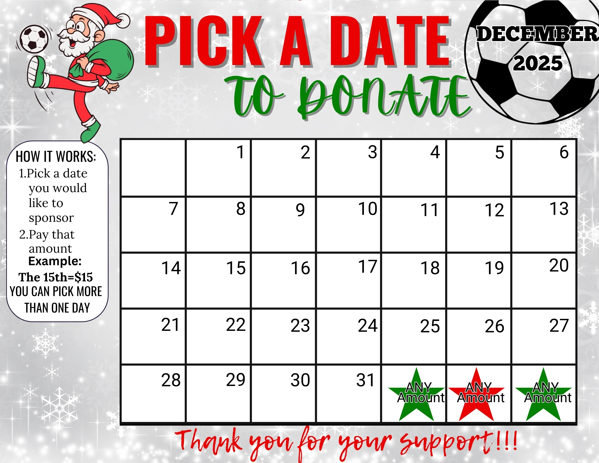 Soccer December Christmas Pick a Date To Donate Fundraiser (INSTANT DOWNLOAD)